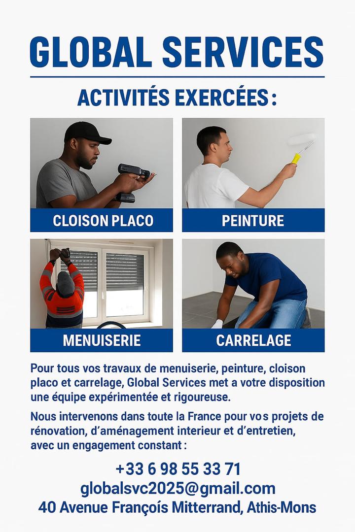 GLOBAL SERVICES est une entreprise enregistrée en France et spécialisée dans les travaux de menuiserie, peinture, cloisons placo et nettoyage professionnel.